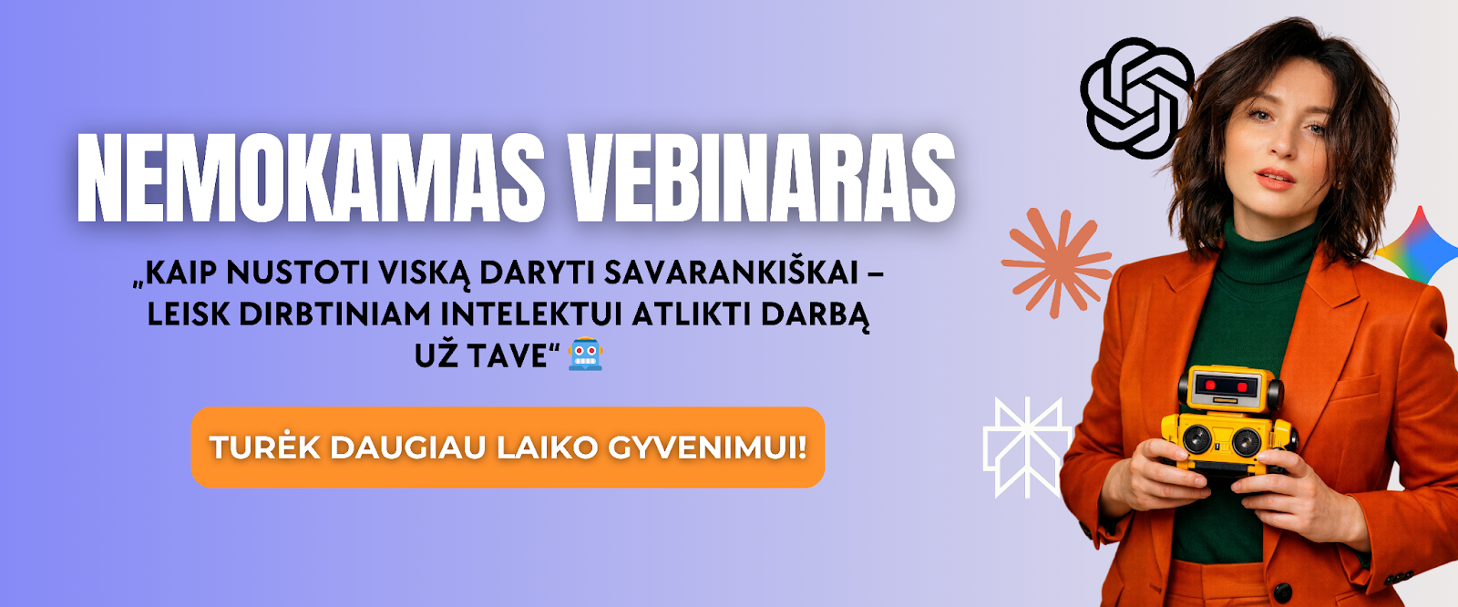 Nemokamas vebinaras “Kaip nustoti viską daryti savarankiškai - leisk dirbtiniam intelektui atlikti darbą už tave” 🤖 Turėk daugiau laiko gyvenimui!
